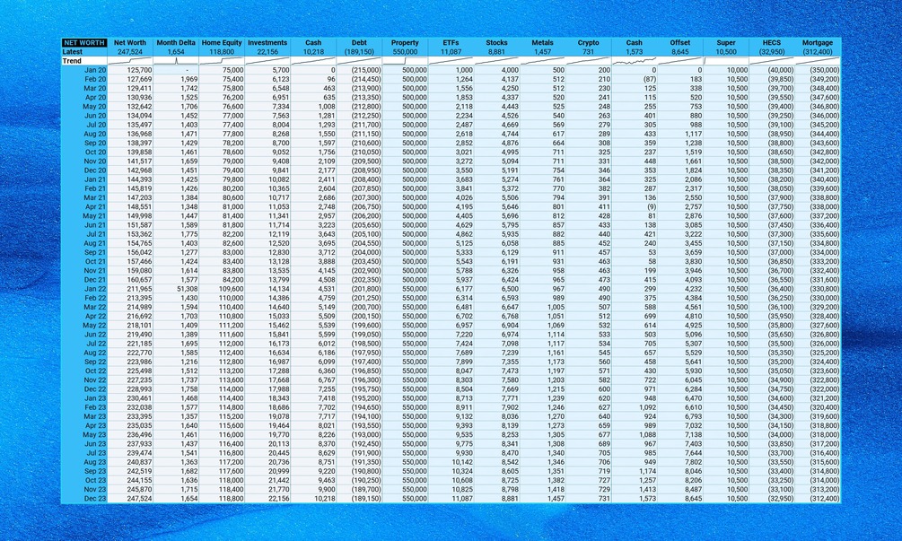 Take control of your personal finances with a beautiful, hand-crafted spreadsheet by Flow Finance. This spreadsheet contains all the elements required to summarize monthly spending, income, and cumulative net worth tracking.